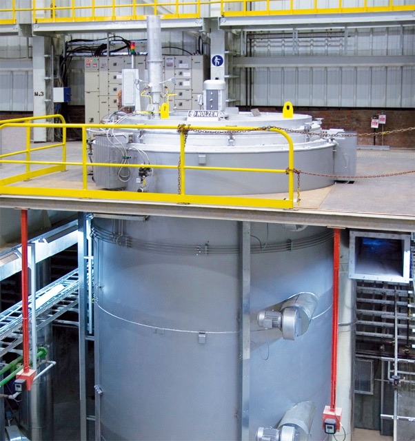 Kran chargiert werden. Durch die i.d.R. versenkten Ofenschächte ergibt sich eine geringe benötigte Kranhakenhöhe. Die senkrechte Behandlung von langen Bauteilen minimiert Maß- und Form-veränderungen. Durch eine Konvektion mittels Umwälzung und einem Gasführungszylinder wird eine hohe Aufheiz- und Abkühlgeschwindigkeit bei gleichmäßigem Wärmeübergang auf die Bauteile erreicht.